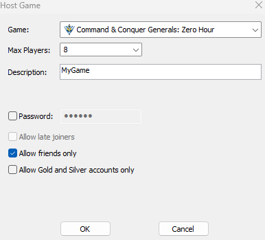- Host a Friends only game of C&C:Generals or C&C:Generals Zero Hour.