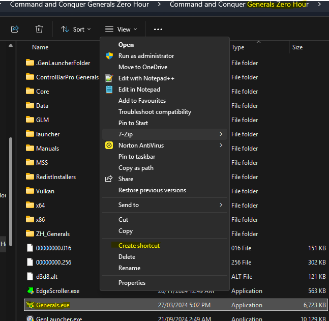 Right click Generals.exe and create shortcut (more options)