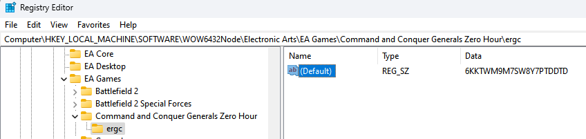 Change your CDKEY for Multiplayer, Open Regedit app and browse toHKEY_LOCAL_MACHINE\SOFTWARE\WOW6432Node\Electronic Arts\EA Games\Command and Conquer Generals Zero Hour\ergc